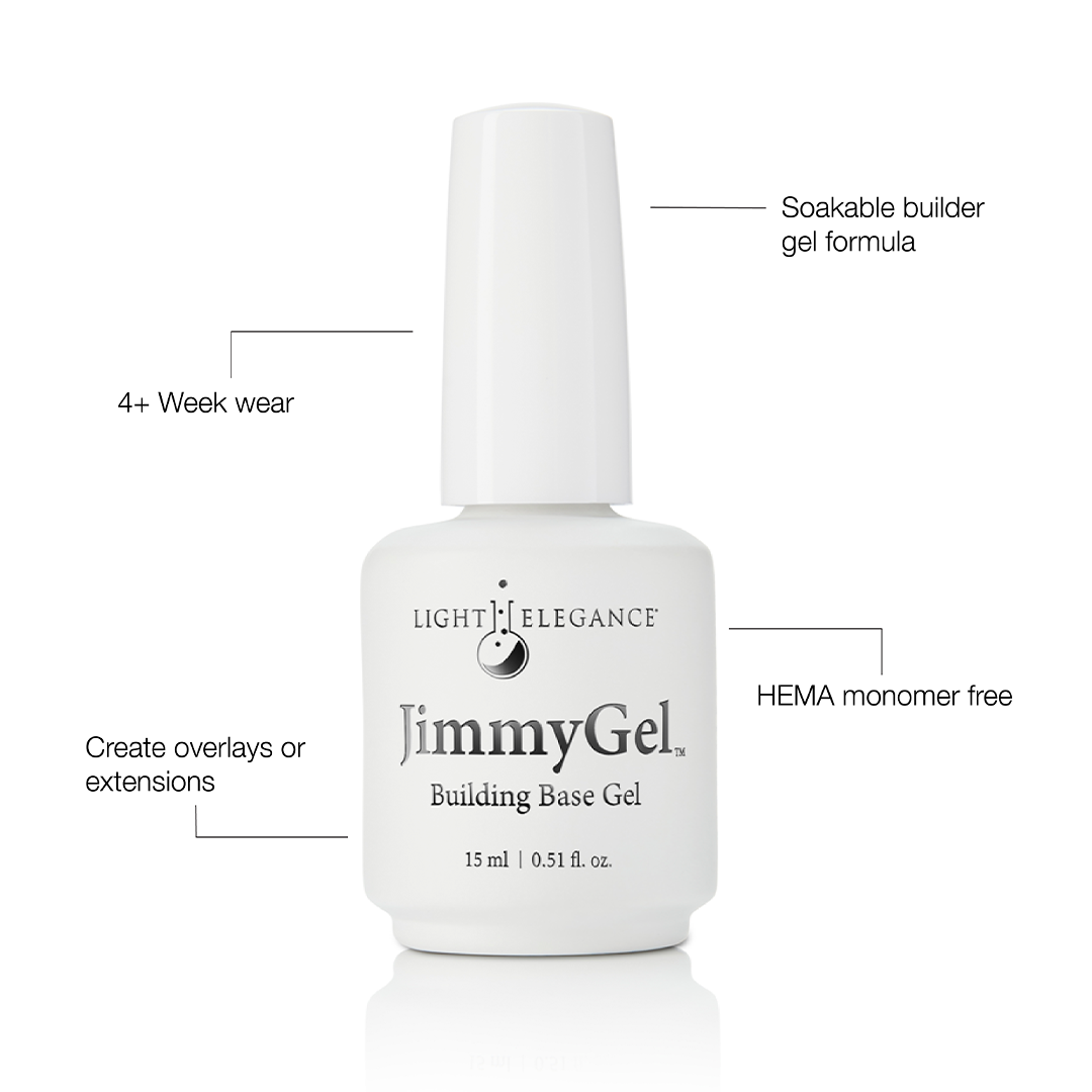 While JimmyGel is compatible with many gel systems, it’s formulated for best performance with Light Elegance gels.