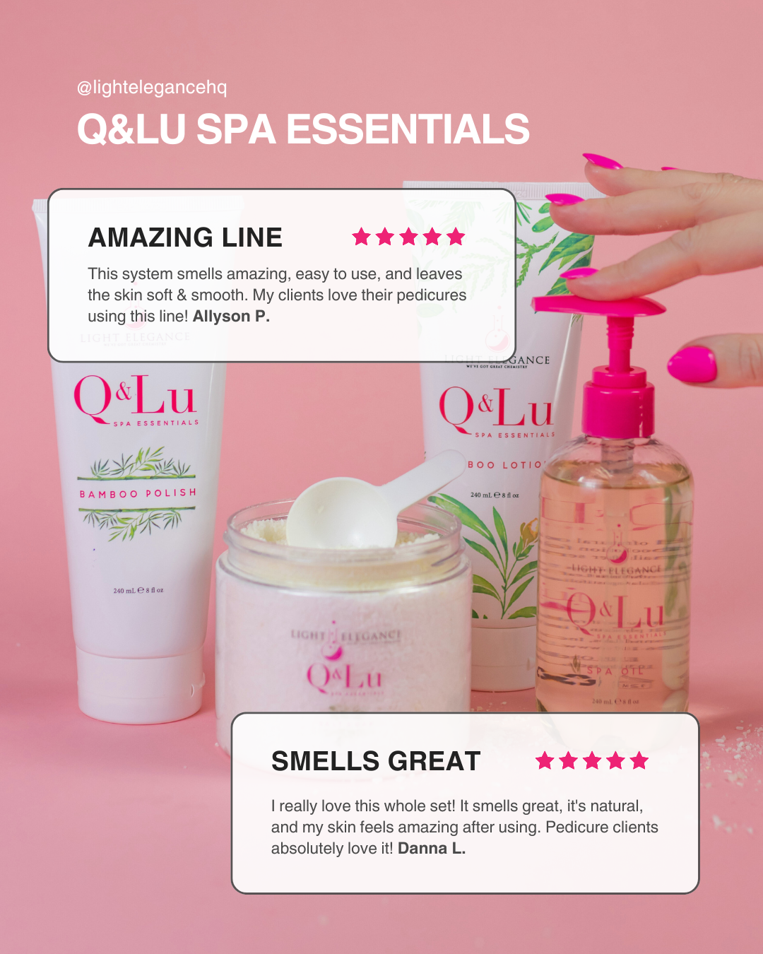 We created Q&Lu Spa Essentials utilizing our award winning chemistry so nail pros could offer an all-natural manicure and pedicure that saves time on every service and delivers a superior spa experience!