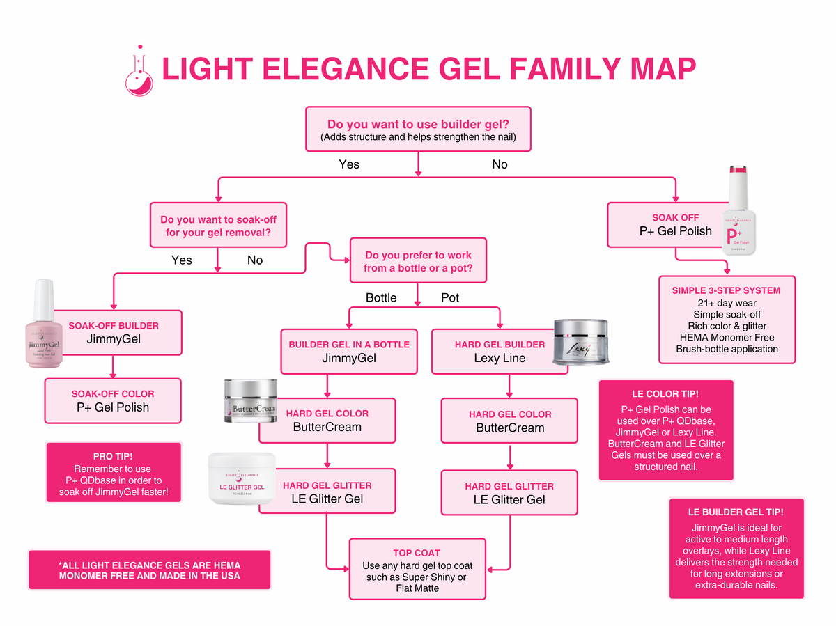 With so many innovative products in the LE lineup, it can be hard to know where to start. This map makes it simple, showing every gel system at a glance and how our systems fit together, helping you compare benefits and choose the perfect gel for every client.