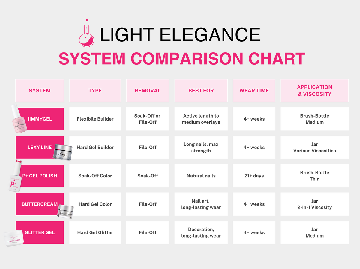 Our side‑by‑side comparison table makes it easy to see how each LE system stacks up. Compare application method and wear time to removal process and versatility. Whether you’re building dramatic extensions, adding flexible overlays, or crafting intricate nail art, you’ll find the perfect match for your salon services!